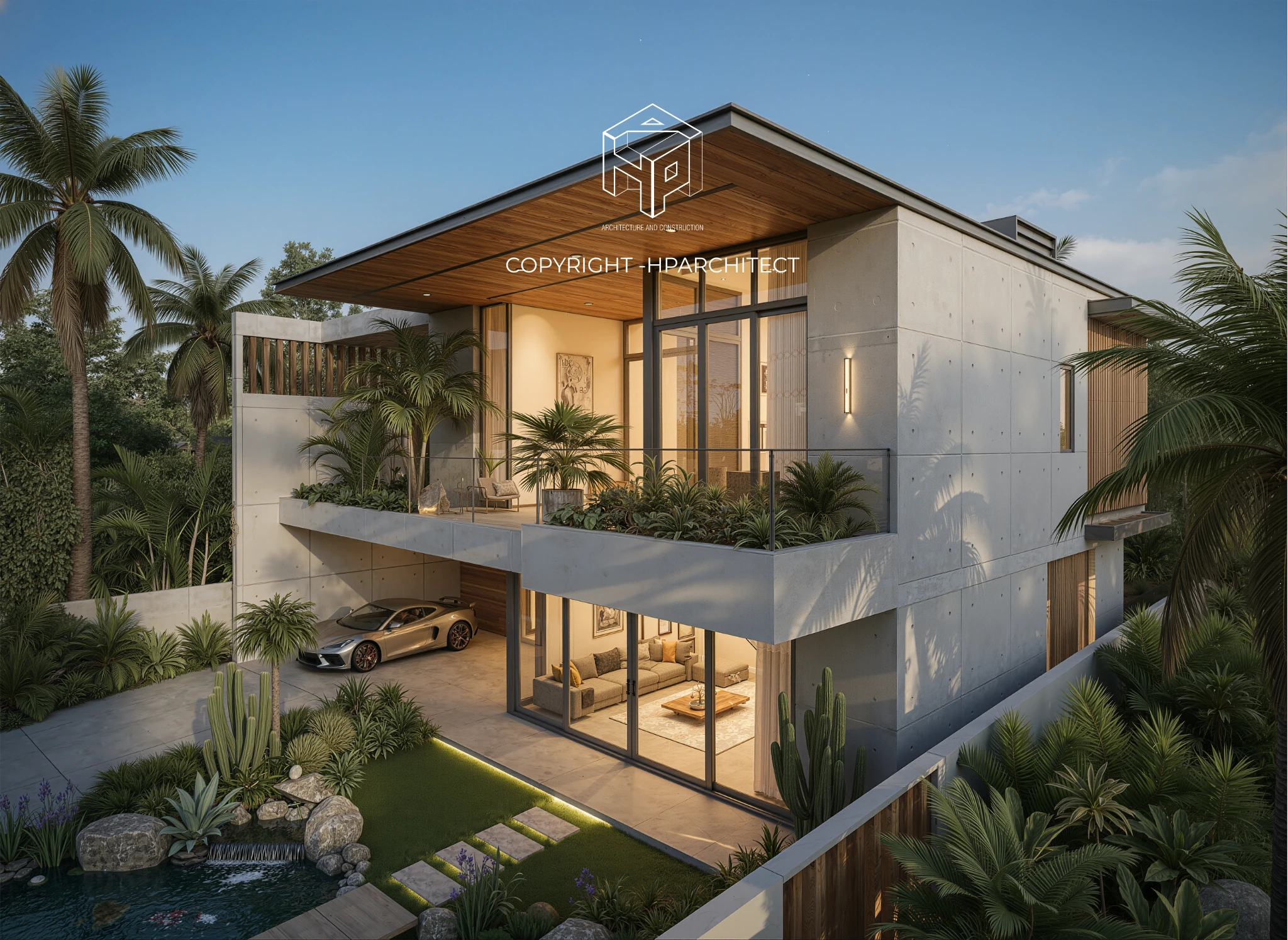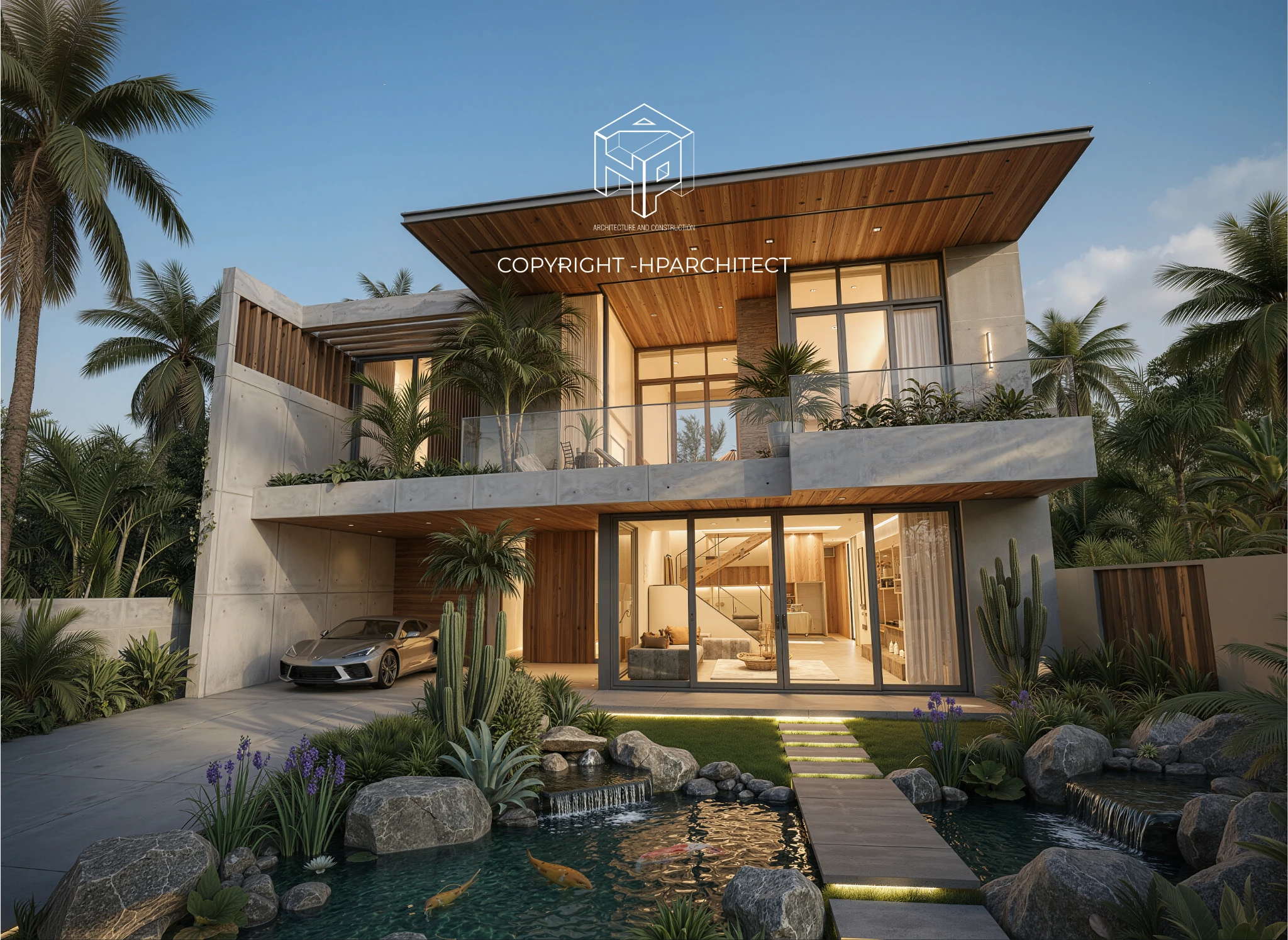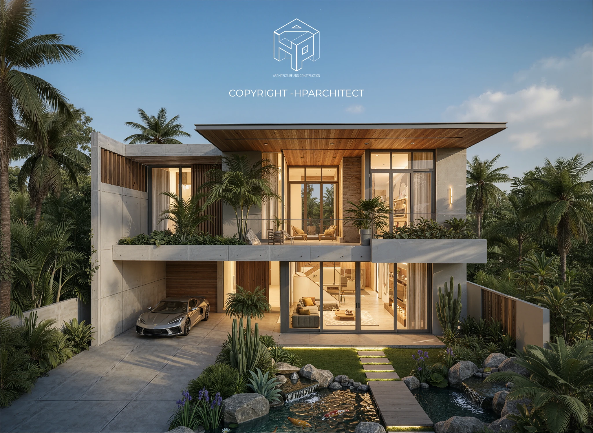 Không gian sân trước được thiết kế như một khu vườn nghỉ dưỡng với hồ cá Koi, đá tự nhiên và mảng xanh đa tầng. Lối đi dẫn vào nhà được bố trí mềm mại, tạo cảm giác thư giãn ngay từ khi bước chân về nhà. Ban công kính tầng 2 kết hợp cây xanh giúp P HOME trở nên thanh thoát, hiện đại và gần gũi với thiên nhiên.