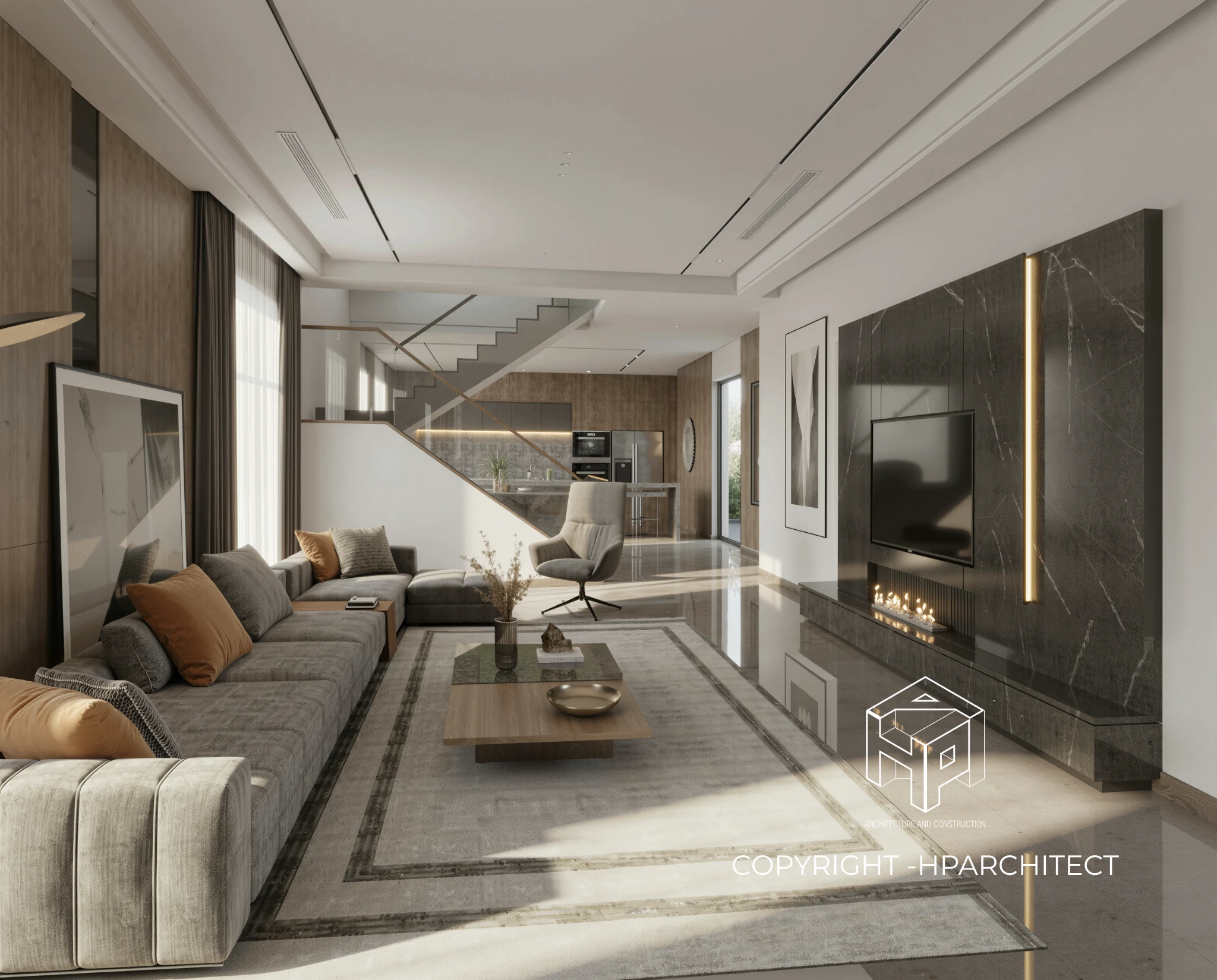 Nội thất phòng khách sử dụng gam màu trung tính kết hợp vật liệu gỗ, thể hiện rõ tinh thần của mẫu nhà hiện đại cao cấp. Cách bố trí không gian mạch lạc, liên thông với bếp và cầu thang, giúp ngôi nhà luôn thông thoáng và thuận tiện trong sử dụng.