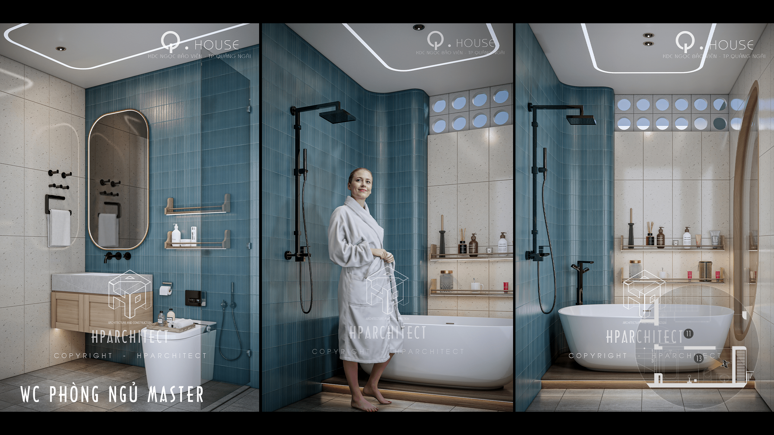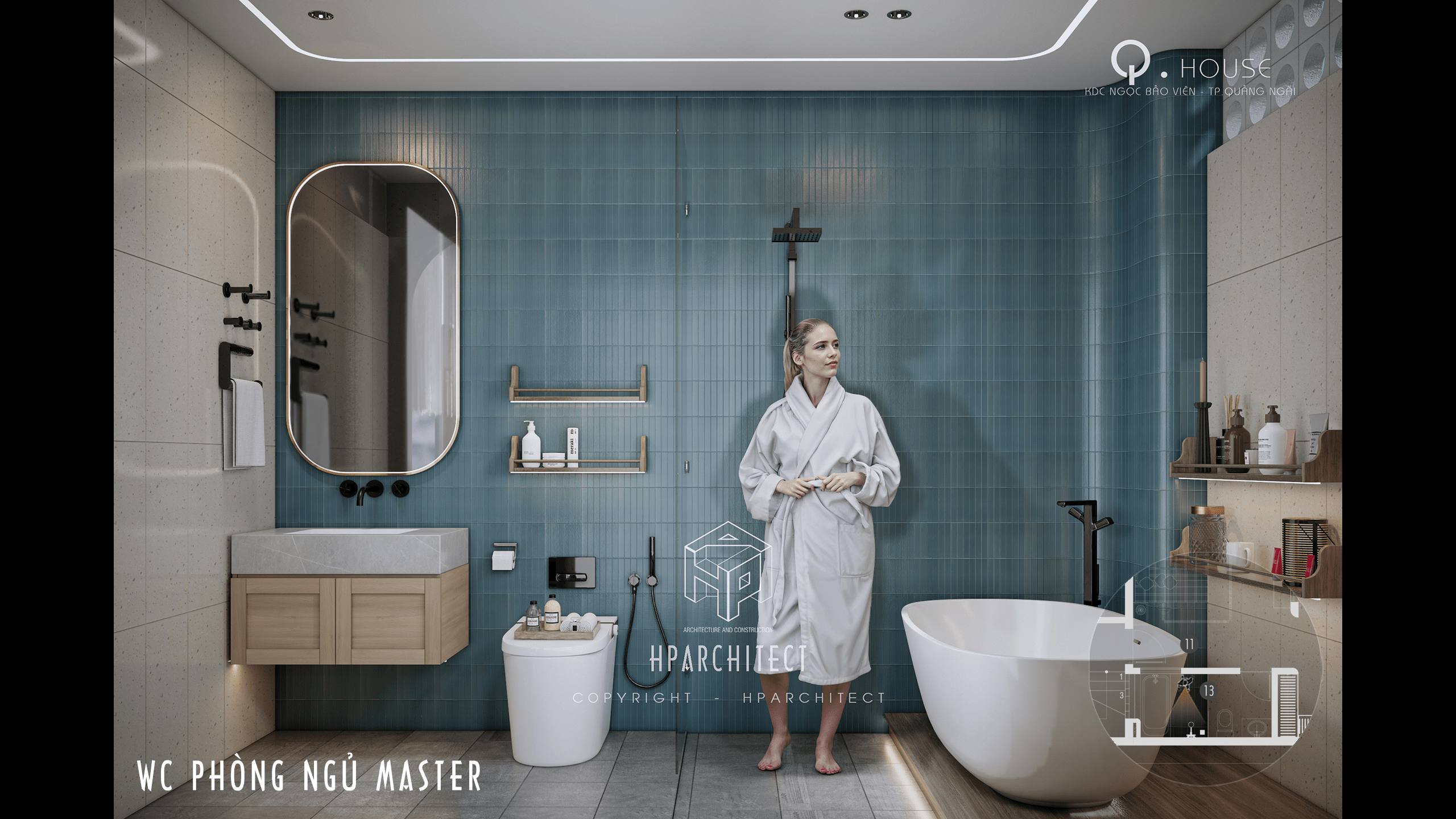Phòng master còn gây ấn tượng với phòng WC ấn tượng được thiết kế nổi bật với gạch ốp xanh dương trên tường tạo nên vẻ độc đáo và tươi mới. Đây là điểm nhấn đặc biệt giúp không gian nội thất trong phòng thêm phần ấn tượng và khác biệt.