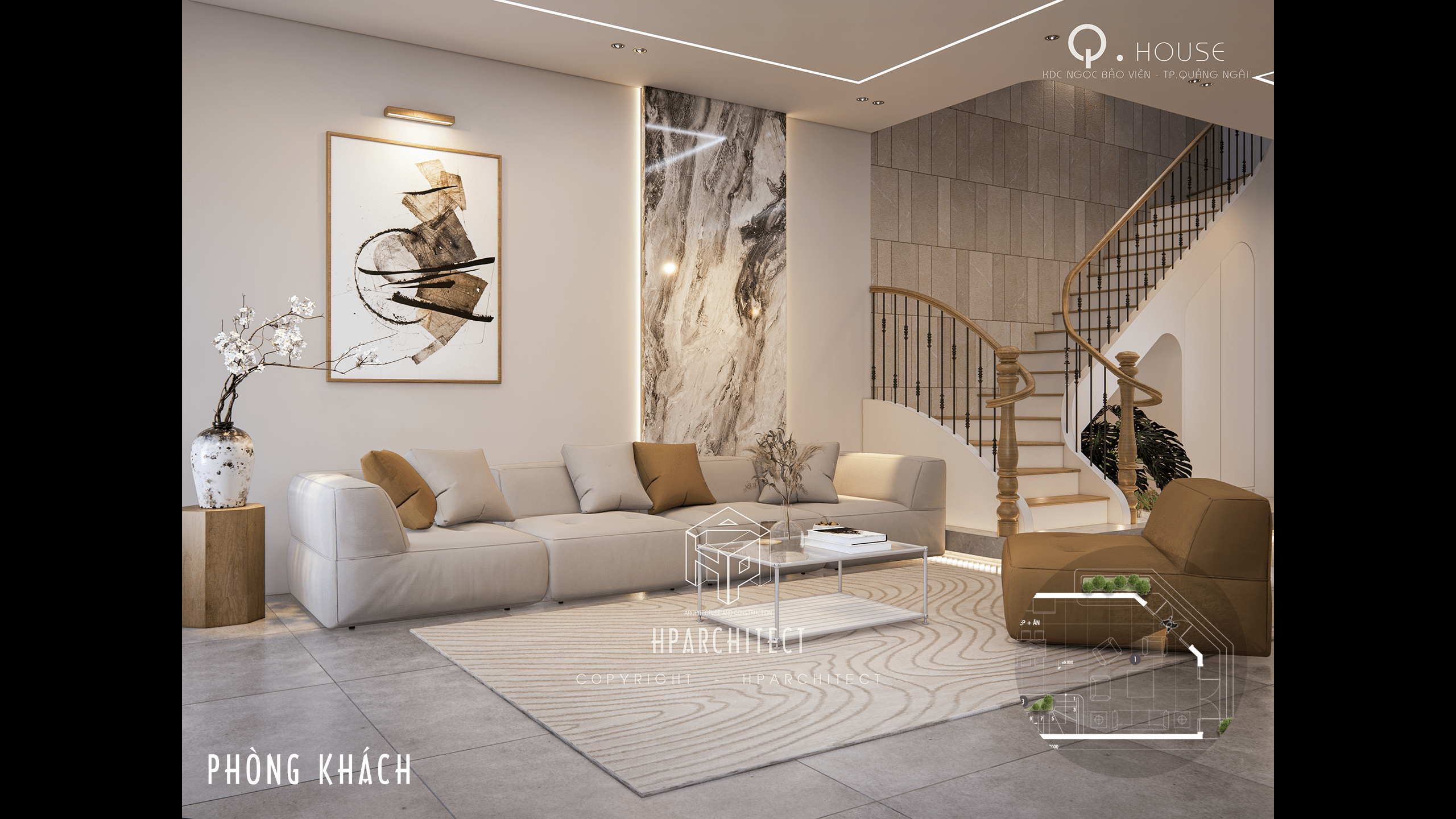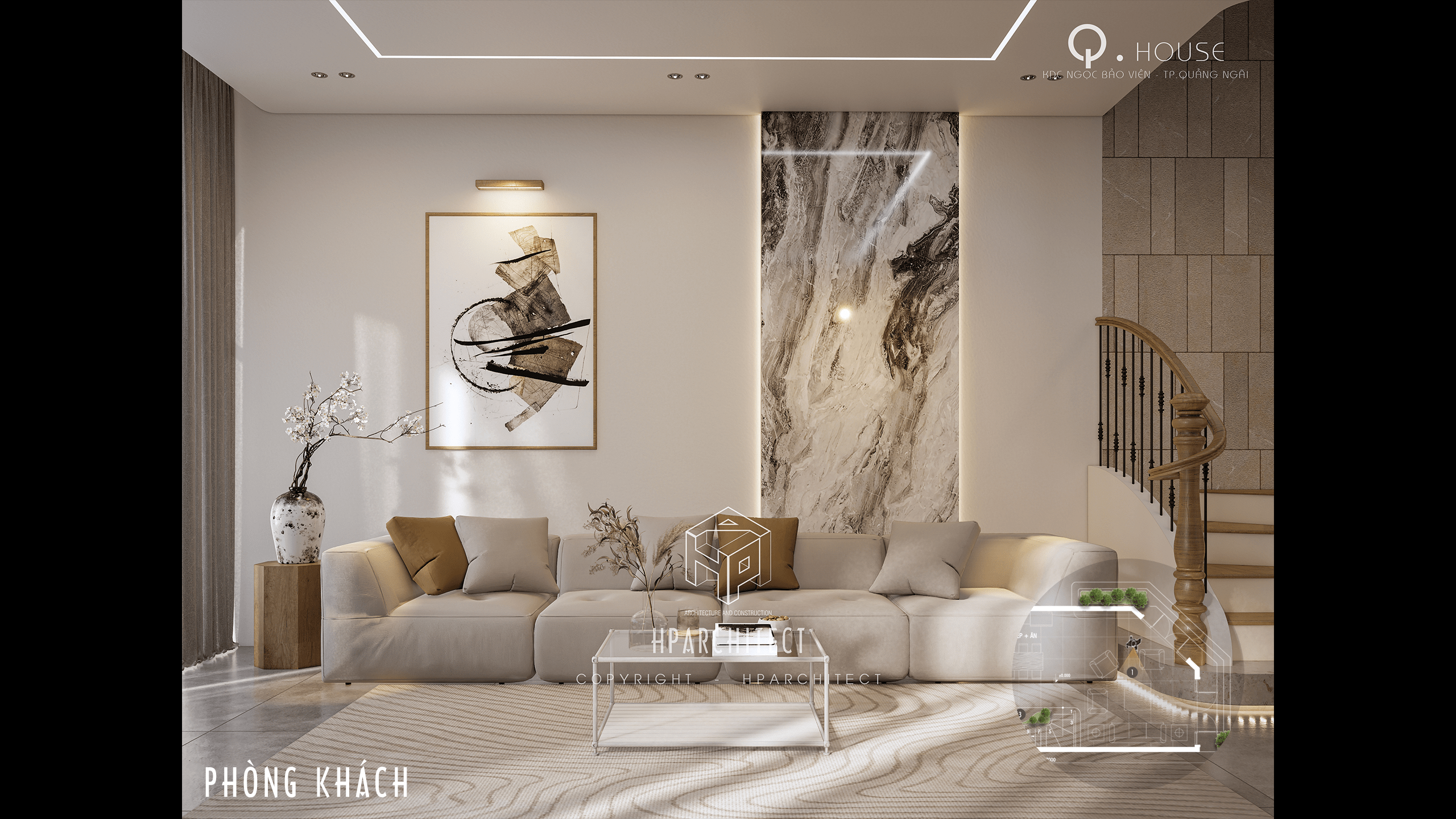 Bước vào bên trong, phòng khách của Q.House được ốp đá Marble sang trọng, làm nổi bật sự tinh tế của không gian. Đây là nơi lý tưởng để gia chủ tiếp đón bạn bè, người thân hoặc thư giãn trong một không gian đẳng cấp và thoải mái.