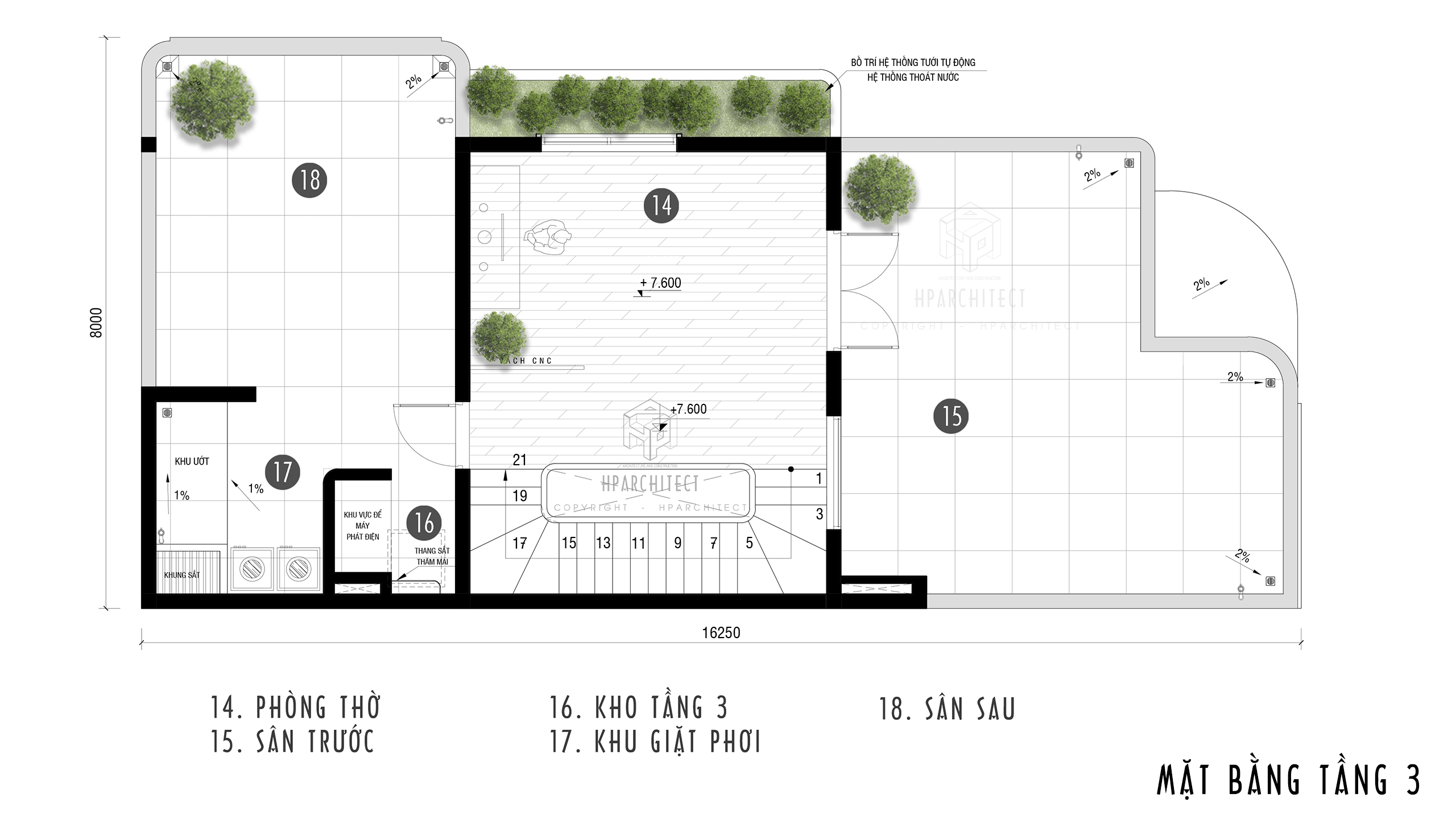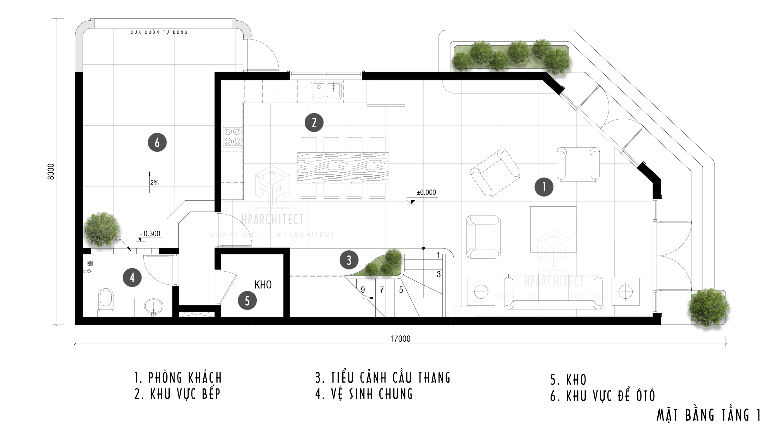 Tầng 1: Tầng trệt được bố trí hợp lý với phòng khách, khu vực bếp mở thông thoáng và một phòng WC hiện đại. Đây là không gian sinh hoạt chung, tạo sự tiện nghi tối đa cho gia đình.