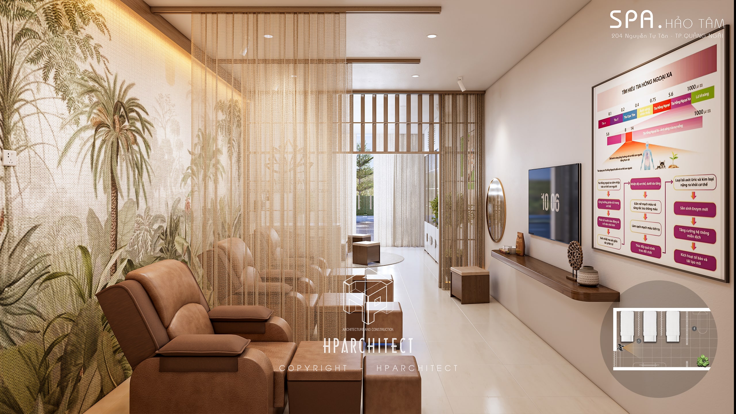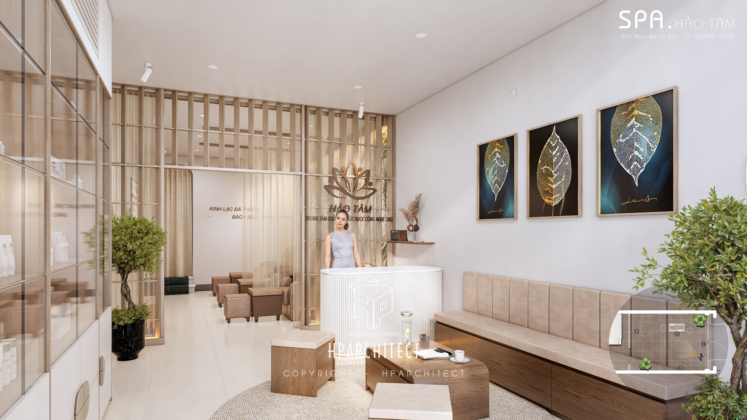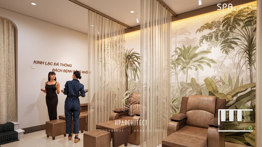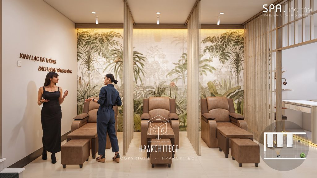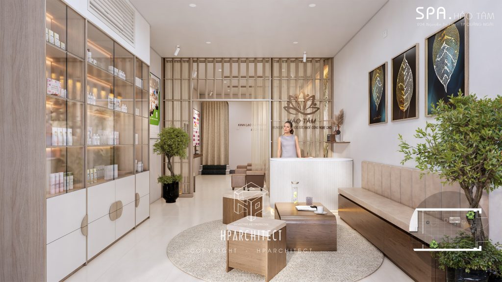 Mỗi chi tiết trong thiết kế nội thất của HẢO TÂM đều được lựa chọn tỉ mỉ mang đến một sự hòa hợp tinh tế trong không gian. Sự kết hợp giữa vật liệu tự nhiên và màu sắc nhẹ nhàng tạo nên không gian lý tưởng để khách hàng tìm lại sự cân bằng, phục hồi thể chất và tinh thần. Từ nhiệt độ màu của đèn chiếu sáng đến nội thất gỗ, tất cả đều được lựa chọn với mục tiêu tạo ra một không gian thư giãn tối đa mà vẫn đảm bảo sự sang trọng và hiện đại.
