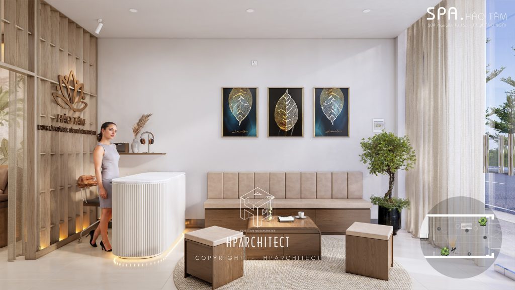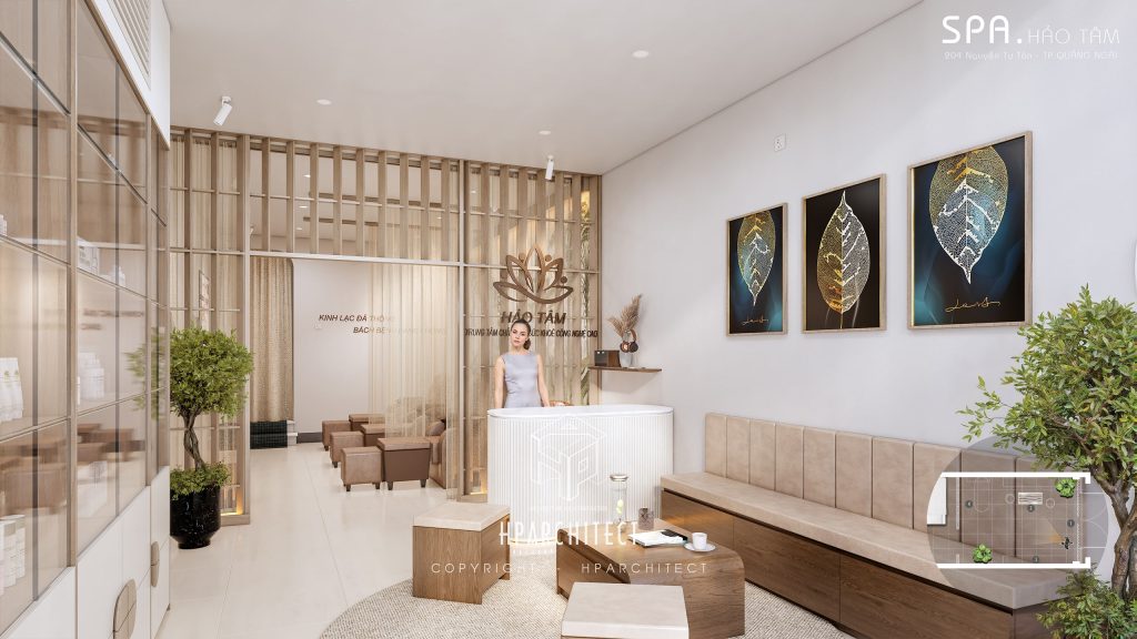 - Khu vực lễ tân & tiếp khách: Được thiết kế mở, với quầy lễ tân cong mềm mại, sofa đơn giản nhưng sang trọng, giúp khách hàng cảm nhận được sự chào đón nhẹ nhàng nhưng chuyên nghiệp.